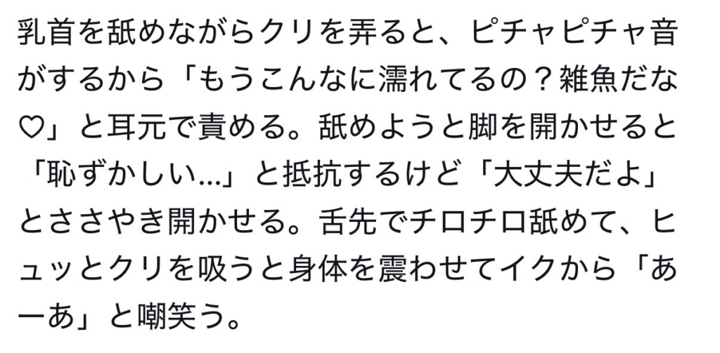 女性の中には、こういった文章を読んで妄想を膨らませて楽しむ方がいるようです。私は文章より写真や映像の方がグッとくるので、「文章で妄想を膨らませる」という女性の気持ちがわかりませんでしたが、とりあえず見よう見まねでポストしてみました。